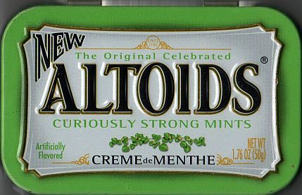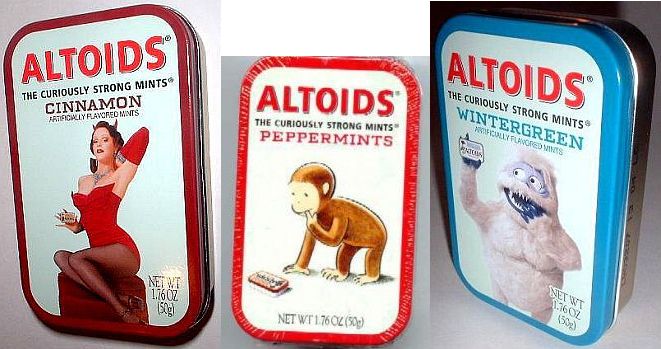 Sindy (portrayed by model Pamela Vandenberg) was featured in numerous magazine and TV ads, from roughly 1999 to 2002, I think. She even had an official website, TooHot.com, though that has long since vanished. Later still, there was a fansite called "There's Something About Sindy," but that's now also gone. (You can see bits of it via the Wayback Machine, though. Or you could check AltoidsAds.com.) As for "the curious little monkey," I've never particularly been a fan, but he does seem the perfect choice to advertise "the original celebrated curiously strong mints." (Because they're both "curious." Get it?) And I have always been a fan of Rudolph the Red Nosed Reindeer, so it was neat to get a tin with the Abominable Snow Monster (aka Bumble). (There have been other character tins, but these are the only three I own.)