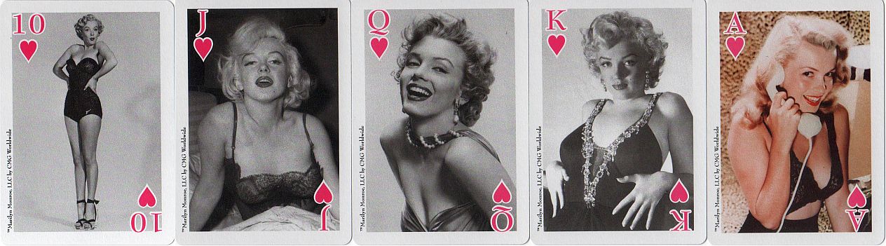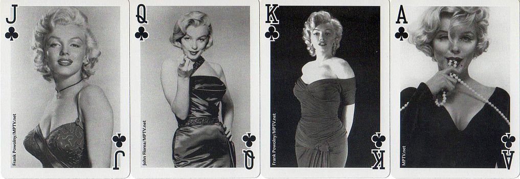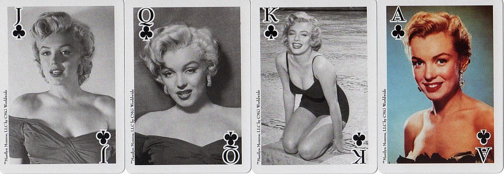 Here are two different decks of Marilyn Monroe playing cards. On the index page, I used a pic of the box the second deck is in, as the link to this page. (The pic on the box of the first deck is the same as the card backs from that deck.) It's kind of odd, I noticed the UPC codes for both decks is exactly the same, even though they're clearly different products. I mean, they each have completely different pictures. But they're both similar in that some of the pics are black & white and some are color, and that it's only the face cards that have different pics. (2-10 of every suit are all the same, though the pics used for those cards are different for each deck.)