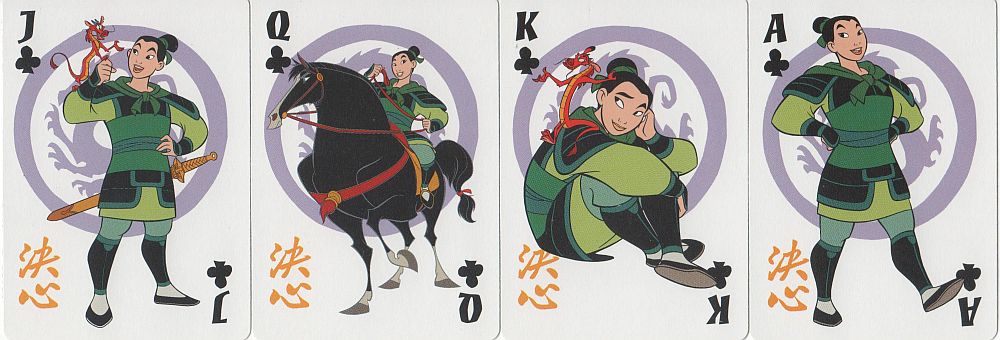 Playing cards based on the movie Mulan. I scanned the face cards, but the numeric cards I didn't bother with, because the pictures on them are just sketches of symbols or animals, mostly. They're nice, but not quite nice enough to overcome my laziness.