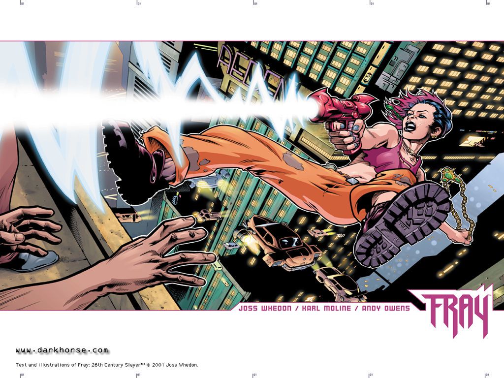 And I guess I can't think what else to say, without giving too much away. There are some shocking twists and flashbacks along the way, but eventually Mel wins her battle. But there'll always be more evil to fight, I suppose. This first story... well it was just really cool, and funny, and dramatic, and whatnot. Plenty of new future slang to learn. I dunno, it's just a good story, and I look forward to seeing more of Fray at some point. For now, I'm happy to see her in Buffy season 8. Before that apparently she was in a "Tales of the Slayers" story, which I've never read, but probably should someday. And I hope she'll be in other stuff, maybe another miniseries or something. We'll see. Anyway, I'd like to say more, but... well, maybe later. It's pretty awesome, though....